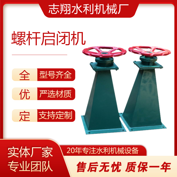 手輪式螺桿啟閉機(jī)由機(jī)殼,機(jī)蓋,支架,螺母,螺桿,壓力軸承,螺桿,蝸輪手搖柄,電機(jī),控制柜等組成。采用螺桿傳動(dòng),蝸輪變速,螺母旋轉(zhuǎn),使螺桿上下運(yùn)動(dòng),帶動(dòng)閘門啟閉。